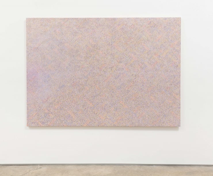 Concurrently Mallinson sought ways to reinsert gesture and relief-like surface textures into her paintings in which those qualities, reflecting the rhetoric of minimalism, had all but disappeared. Profoundly influenced by both feminist politics and the Pattern & Decoration artists, she turned to the intricate, often dizzying designs of textiles and embroideries from many cultures for inspiration. Many of those products were grid based, so Mallinson retained an underlying grid structure that had characterized her early abstract paintings as well as the large scale—perceived as a sign of ambitious painting. In a synthesis of minimalism and “maximalism”, she began laboriously layering thousands of tiny brushstrokes or pencil marks in interlocking designs to create dense, sensual fields of impressionistic color